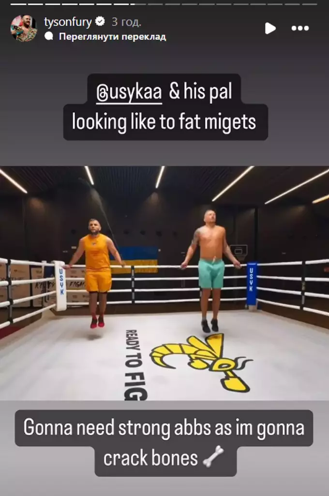 «Усик та його партнер схожі на товстих карликів. Тобі буде потрібен сильний прес, бо я буду ламати кістки», – написав Тайсон у своєму інстаграмі.