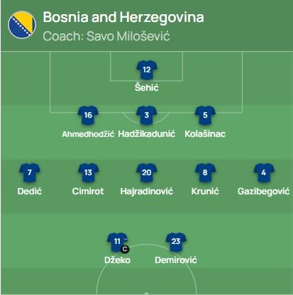 Боснія і Герцеговина: Шехич, Колашинац, Хаджикадунич, Ахмедходжич, Газибегович, Дедич, Хайрадинович, Крунич, Цимирот, Демирович, Джеко