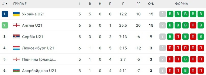 Перемігши, збірна Англії U-21 набрала 15 очок і зрівнялася з командою України U-21, але поступається їй за додатковими показниками. Команда Азербайджану U-21 посідає останнє, шосте, місце в групі з 3 набраними пунктами.