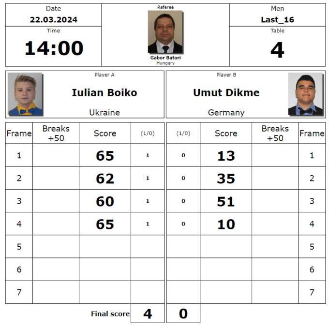 Вдень 22 березня українець у 1/8 фіналу розгромив Умута Дікме з Німеччини (4:0) та вийшов у чвертьфінал.