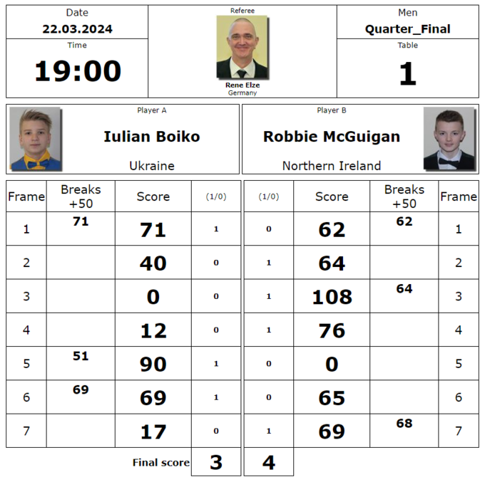 Однак у напруженому матчі 1/4 фіналу Юліан Бойко припустився помилки у вирішальному фреймі і програв Роббі Макгігану з Північної Ірландії (3:4). Українець у чудовій позиції промазав просту червону кулю у праву кутову лузу, і суперник забрав 7-му партію з брейком 68.