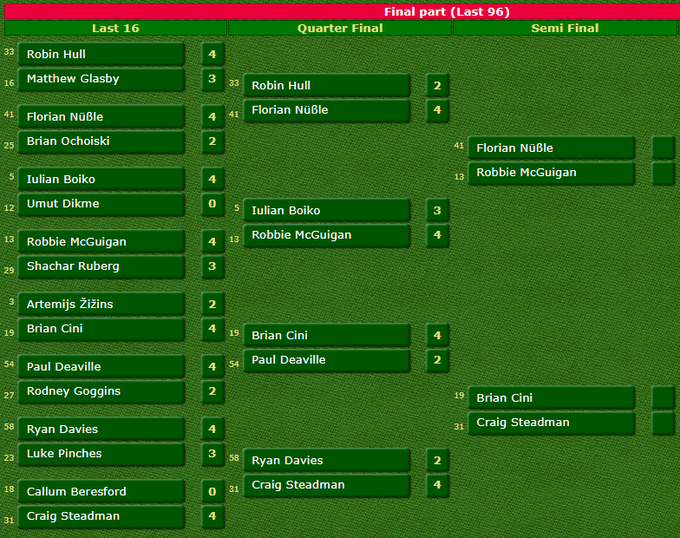 - Флоріан Нюссле (Австрія) – Роббі Макгіган (Північна Ірландія) – 3:4