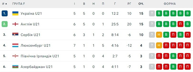 У турнірній таблиці відбіркової групи F, де грає українська збірна, зберігається двовладдя: маючи по 15 очок, лідирують команди України та Англії. При цьому у «синьо-жовтих» є один матч у запасі. За ними розташовується збірна Сербії U-21 (10 очок після 6 матчів), яка, судячи з усього, про потрапляння в топ-2 може забути.