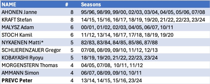 Повертаючись до Петера Превца, він став п'ятим представником збірної Словенії, який перемагав у нинішньому сезоні – після свого молодшого брата Домена, Ланішека, Зайца і Ловро Коса. Попереднього разу таке досягнення підкорилося збірній Норвегії в сезоні 2017/2018. Також п'ятнична перемога дозволила Превцу-старшому вчетверте за кар'єру подолати рубіж у 1000 набраних очок за сезон. Словенець став десятим стрибуном в історії, якому вдавалося подолати цей гросмейстерський рубіж чотири або більше разів: