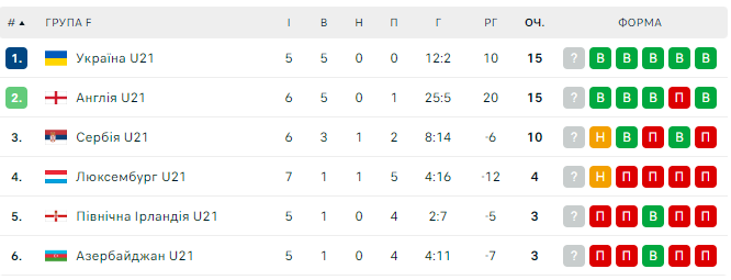 Кваліфікація Євро-2025 U-21. Група F. Турнірна таблиця