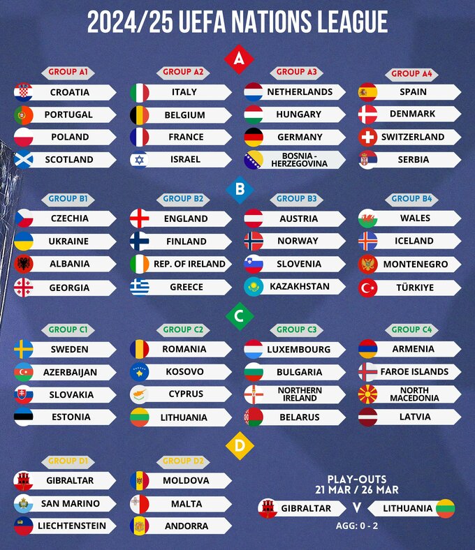 Литва залишається в Лізі націй C, а Гібралтар виступатиме в Лізі націй D у сезоні 2024/25.