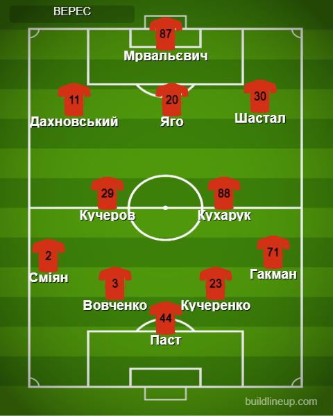 «Верес»: Паст - Гакман (Балан, 75), Вовченко, Кучеренко, Сміян - Кучеров, Кухарук (Кльоц, 63) - Шастал (Янаков, 63), Яго (М. Шестаков, 46), Дахновський (Курко, 75) - Мрвальєвич