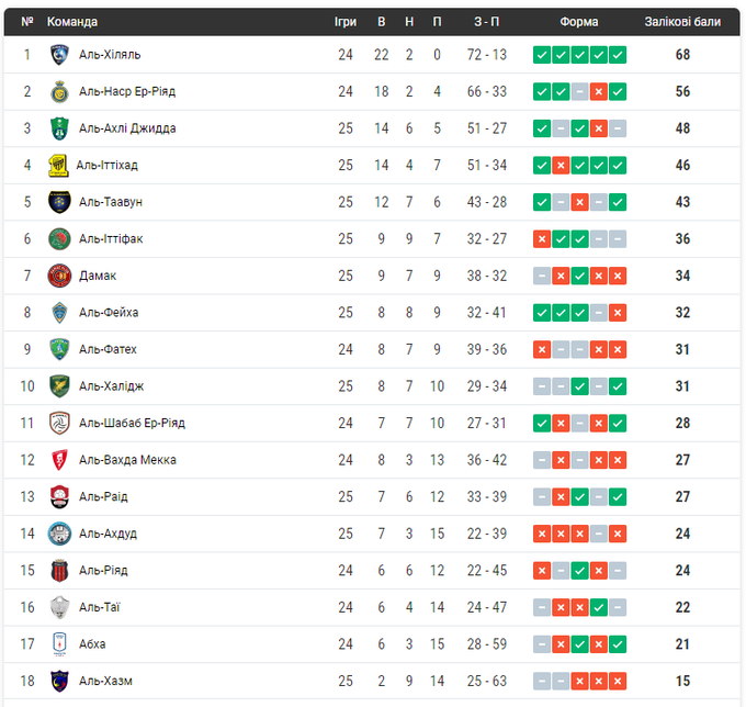 У турнірній таблиці перевага Аль-Хіляля над Аль-Наср (командою португальця Кріштіану Роналду) становить 12 очок (68 проти 56). Далі йдуть: Аль-Ахлі (48), Аль-Іттіхад (46), Аль-Таавун (43).