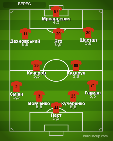 Заміни Вереса: М. Шестаков – 5,0, Кльоц – 5,0, Янаков – 5,5, Курко – 5,5, Балан -– 5,0
