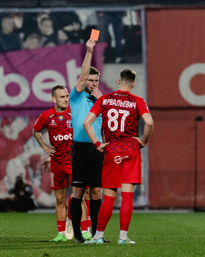 А наприкінці тайму «Верес» залишився у меншості. Мрвальєвич втікав у контратаку, його збив Стецьков, а форвард відмахнувся. Арбітр спершу показав обом по гірчичнику (за фол і відмашку), але після підказки ВАР справедливо покарав брутальний удар ліктем чорногорця прямою червоною карткою.
