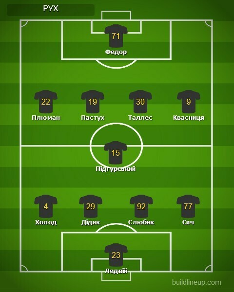 «Рух»: Ледвій, Слюбик, Дідик, Сич, Холод, Підгурський (Притула, 73), Пастух, Таллес, Квасниця (Лях, 80), Плюман (Руніч, 80), Федор