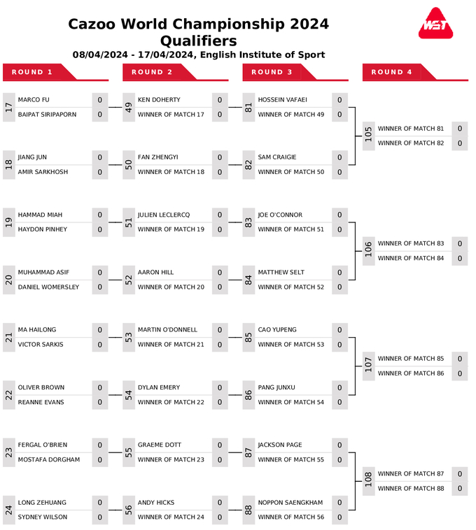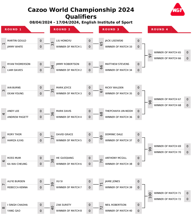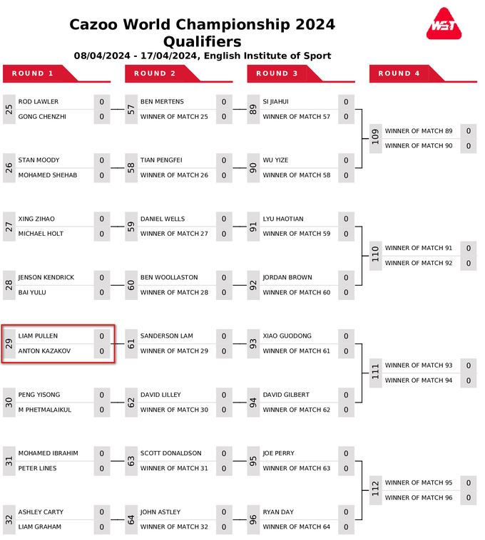 Усі гравці поза топ-16 змагаються у кваліфікації за путівки до фінального раунду, що пройде з 20 квітня до 6 травня у відомому театрі Крусібл у Шеффілді. Найкращі 16 гравців світового рейтингу включені одразу до 1/16 фіналу.