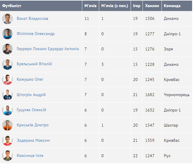 - 1. Владислав Ванат (Динамо): 11+7=18