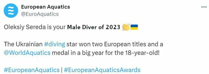 Українець Олексій Середа названий найкращим спортсменом року в стрибках у воду серед чоловіків у Європі за підсумками щорічної церемонії European Aquatics Awards 2023.