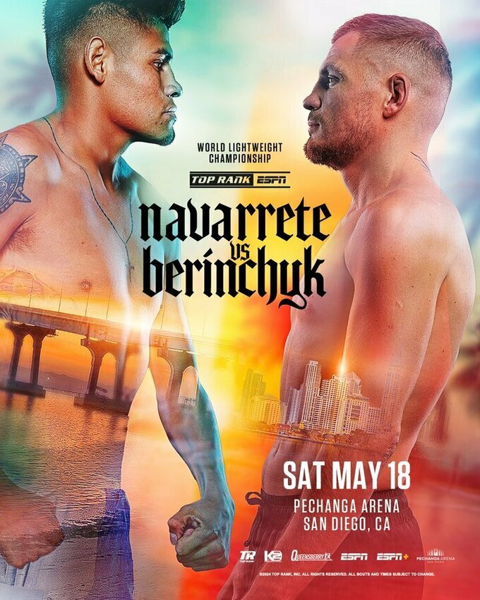 18 травня в Сан-Дієго, США, чемпіон WBO International у легкій вазі Денис Берінчик вийде в ринг проти чинного чемпіона світу за версією WBO у другій напівлегкій вазі Емануеля Наваррете.