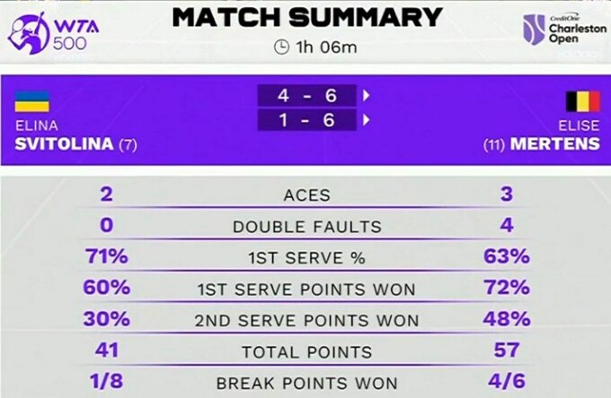 Under the radar 👇@elise_mertens defeats Svitolina 6-4, 6-1 to set up a QF battle against Danielle Collins!#CharlestonOpen pic.twitter.com/cAUFPPvoss