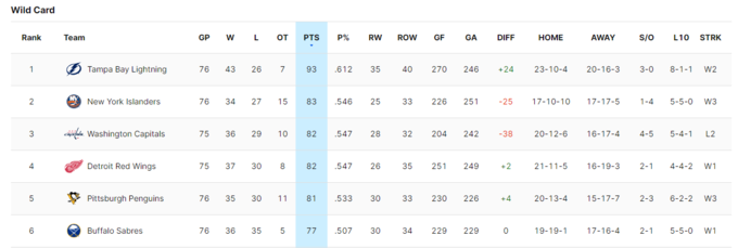 На Сході важливу перемогу над Вашингтоном здобув Піттсбург. Обидві команди ще розраховують вийти у плей-оф, а Пінгвіни тепер відстають від другого wild-card місця лише на два очки. У боротьбі за одну позицію зараз перебувають Детройт, Нью-Йорк Айлендерс, Піттсбург та Вашингтон.