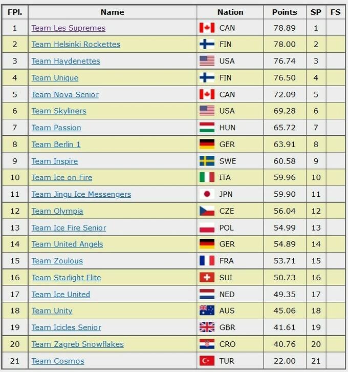 Колектив із Монреалю за свою коротку програму набрав 78.89 балів – на 0.89 балів більше, ніж фінські «Helsinki Rockettes», які посідають друге місце. Замикає першу трійку команда «Haydenettes» із США з оцінкою 76.74 бали.