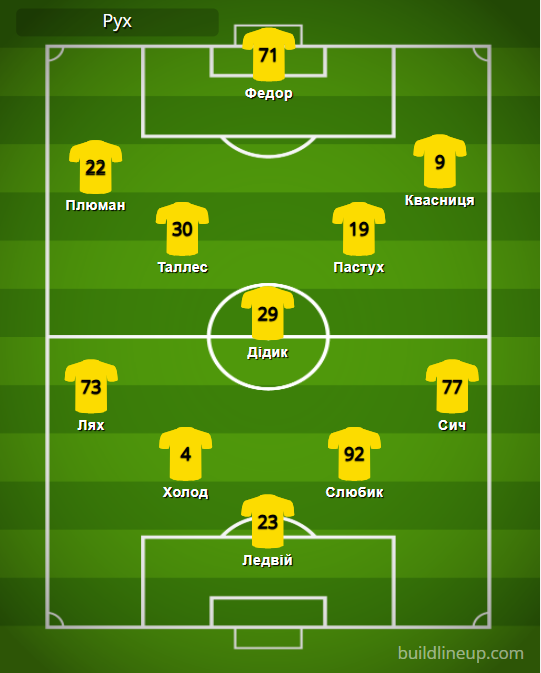 «Рух»: Ледвій – Лях (Притула, 60), Холод, Слюбик, Сич – Таллес (Теслюк, 85), Дідик, Пастух – Плюман (Джурабаєв, 85), Федор (Клайвер, 85), Квасниця (Руніч, 70).
