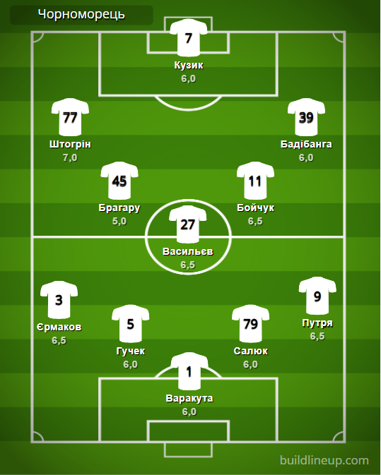 «Чорноморець»: Варакута – Єрмаков, Гучек, Салюк, Путря – Брагару, Васильєв, Бойчук (Ієде, 54) – Штогрін, Кузик, Бадібанга (Альваренга, 74).