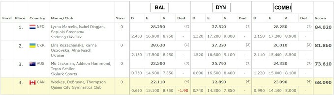 Українки виграли кваліфікацію з першим результатом у балансі та другим у динаміці, але у фінальній вправі поступилися нідерландським спортсменкам Люні Марселіс, Ісабель Дінг'ян та Секвойї Стенсмі. Третє місце посіли Міа Джекмен, Еддісон Хеммонд та Тіган Шіллер з Австралії.