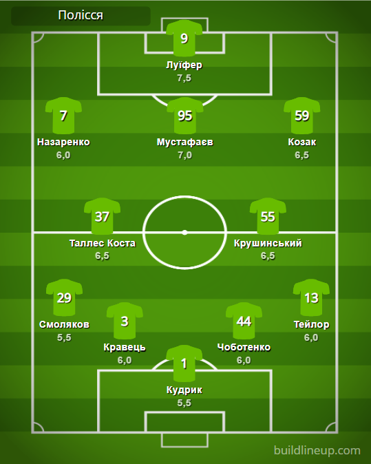 «Полісся»: Кудрик – Смоляков, Кравець, Чоботенко, Тейлор (Михайліченко, 64) – Таллес Коста, Крушинський (Танковський, 53) – Назаренко (Петряк, 64), Мустафаєв (Грицук, 60), Козак – Луїфер (Будківський, 60).