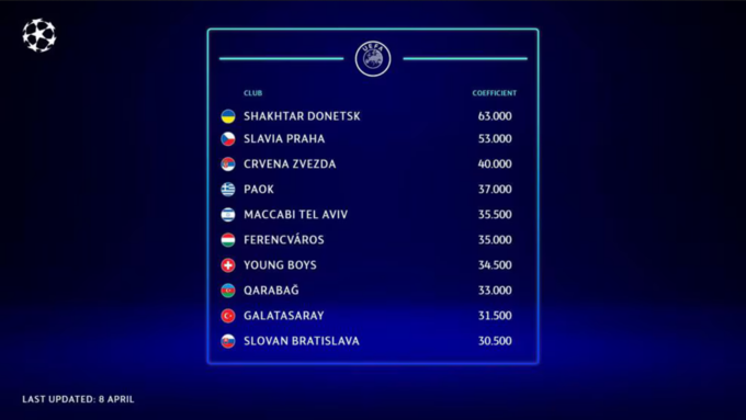 Якщо переможець цього сезону Ліги чемпіонів кваліфікується до ЛЧ через свій чемпіонат, то одне місце дістанеться команді з найвищим клубним коефіцієнтом за останні 5 років. Таблиця УЄФА показує, що таким клубом зараз є «Шахтар», який значно випереджає «Славію» Прага. Але команді Маріно Пушича потрібно виграти УПЛ цього сезону.