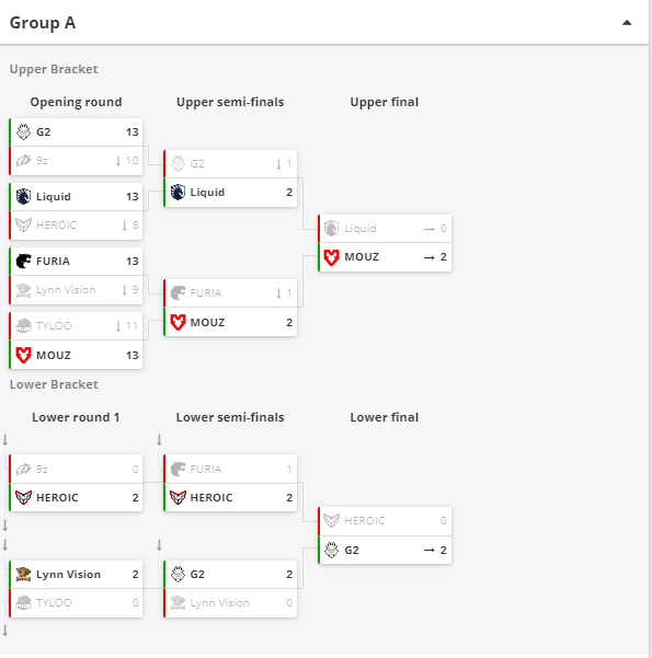 Легендарна команда Astralis, яка останнім часом показувала не дуже добрі результати, здобула чергову перемогу. Цього разу данці без проблем обіграли представників росії Virtus.pro (2:0). У сітці переможців MOUZ обіграли Team Liquid (2:0).