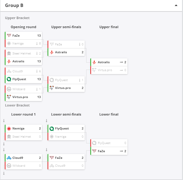 У нижній сітці відбулося більше зустрічей. Варто виділити успіх FaZe Clan. У перший день турніру вони програли Astralis, але все одно вийшли до другого етапу, оскільки сьогодні були сильнішими за Cloud9 (2:0) та FlyQuest (2:0).