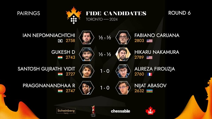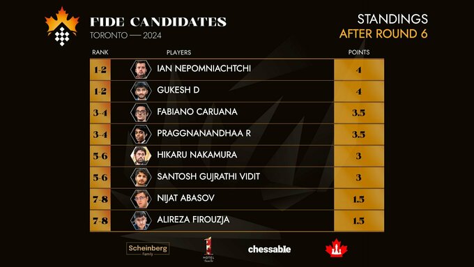 У чоловічому турнірі два лідери – Ян Непомнящий (FIDE) та Гукеш Доммараджу (Індія) – по 4 очки з 6.