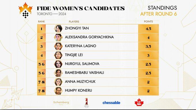 Тань Чжун'ї очолює таблицю після 6-го туру, маючи 4,5 очки із 6. Анна Музичук ділить останні 7–8 місця (по 2 очки із 6).