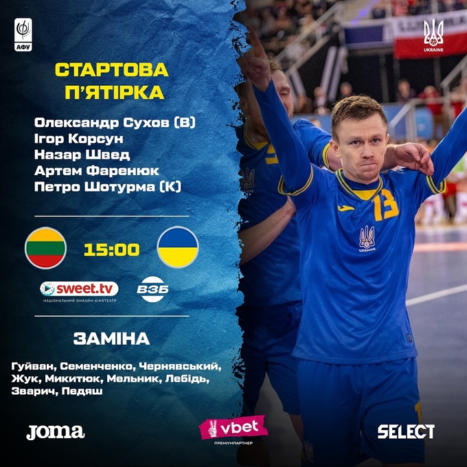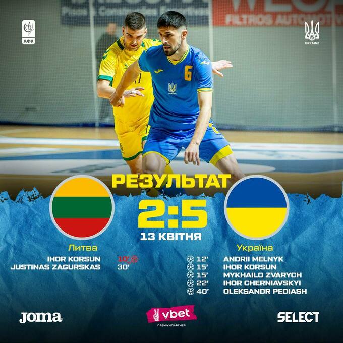 На старті змагань синьо-жовті впевнено обіграли з рахунком 5:2 команду Литви, яка є господарем Євро-2026 з футзалу.