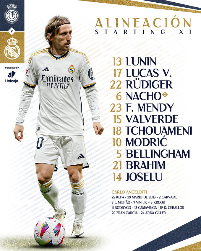 Наставник «Реала» Карло Анчелотті обрав стартовий склад, давши можливість деяким гравцям команди відпочити до наступного матчу ЛЧ проти «Манчестер Сіті». З перших хвилин вчергове зіграє український воротар Андрій Лунін, для якого це буде 26 матч у цьому сезоні у старті.