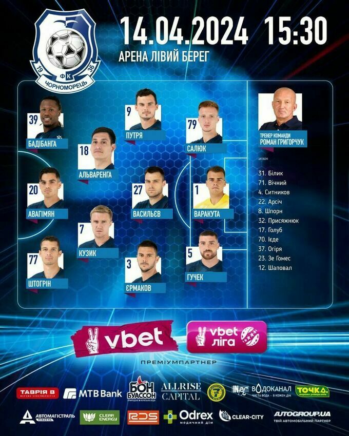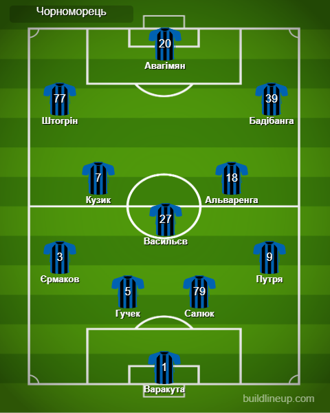 «Чорноморець»: Варакута – Путря (Голуб, 90+1), Гучек, Салюк, Єрмаков – Альваренга, Васильєв, Кузик (Зе Гомеш, 80) – Штогрін, Бадібанга – Авагімян (Присяжнюк, 80).