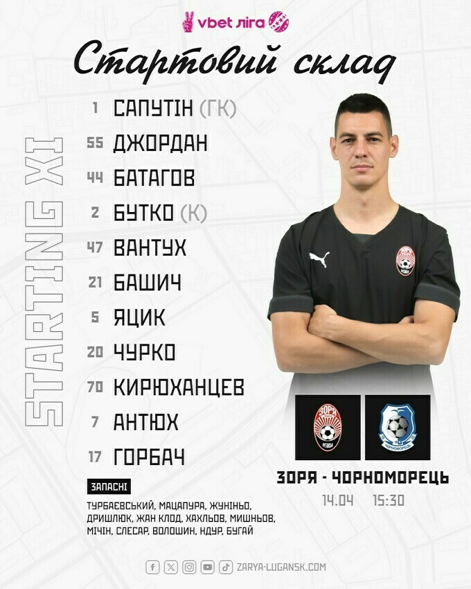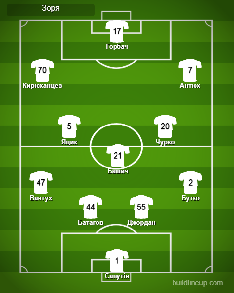 «Зоря»: Сапутін – Батагов, Джордан, Бутко, Вантух – Башич, Яцик (Мишньов, 87), Чурко (Дришлюк, 81) – Кирюханцев (Жуніор Рейс, 73), Антюх (Бугай, 87) – Горбач (Ндур, 73).