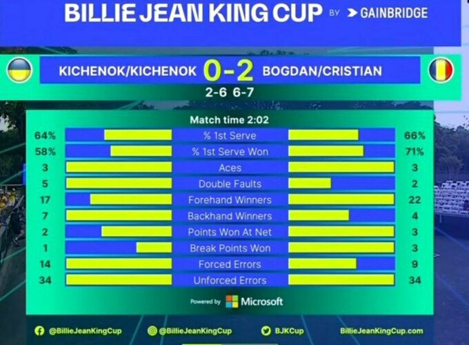 Таким чином, збірна України програла матчове протистояння команді Румунії і не зуміла пробитися у світовий фінал Кубка Біллі Джин Кінг, хоча після першого ігрового дня рахунок був 2:0 на користь «синьо-жовтих».