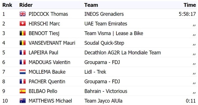 У фінішному спринті Підкок випередив швейцарця Марка Хірші з «UAE Emirates» і бельгійця Тіша Беноота з «Visma – Lease a Bike».