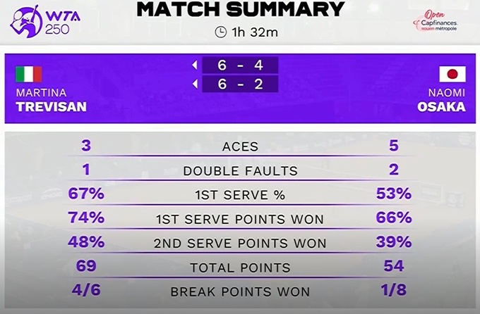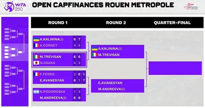 Італійська тенісистка Мартіна Тревізан (№78 WTA) у двох сетах здолала експершу ракетку світу Наомі Осаку з Японії (№192 WTA) та в наступному раунді змагатиметься проти третьої сіяної українки Ангеліни Калініної (№32 WTA).