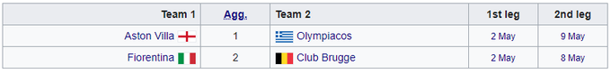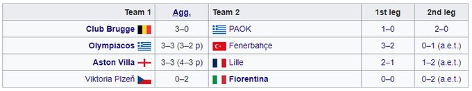 У півфіналах зустрінуться: Олімпіакос – Астон Вілла, Фіорентина – Брюгге
