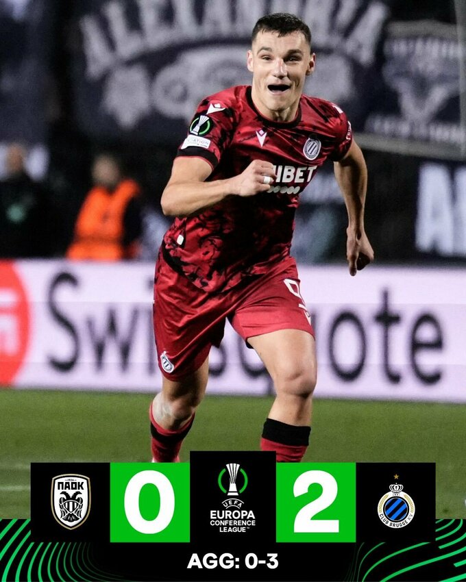 Брюгге на виїзді вдруге переміг грецький ПАОК. Дубль гостей наприкінці першого тайму оформив Ферран Хутгла. Вигравши обидва матчі (1:0 та 2:0), бельгійська команда вийшла до півфіналу Ліги конференцій.
