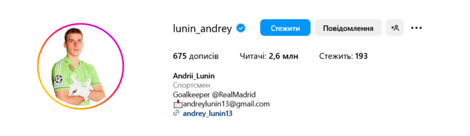 Український воротар «Реала» Андрій Лунін після феєричного виступу в матчі чвертьфіналу Ліги чемпіонів проти «Манчестер Сіті» стрімко набирав підписників у Instagram і тепер став найпопулярнішим українським спортсменом у цій соцмережі.