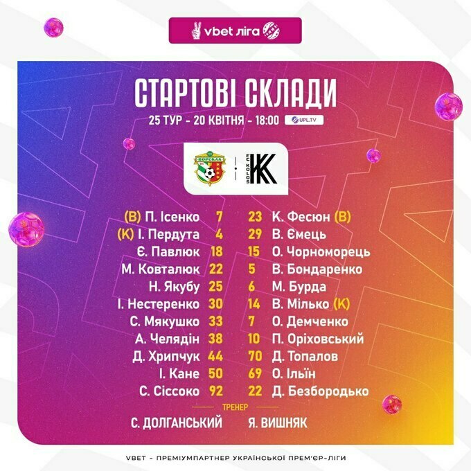 Запасні: Горох, Мисак, Кукош, Гончаренко, Дорош, Паулаускус.