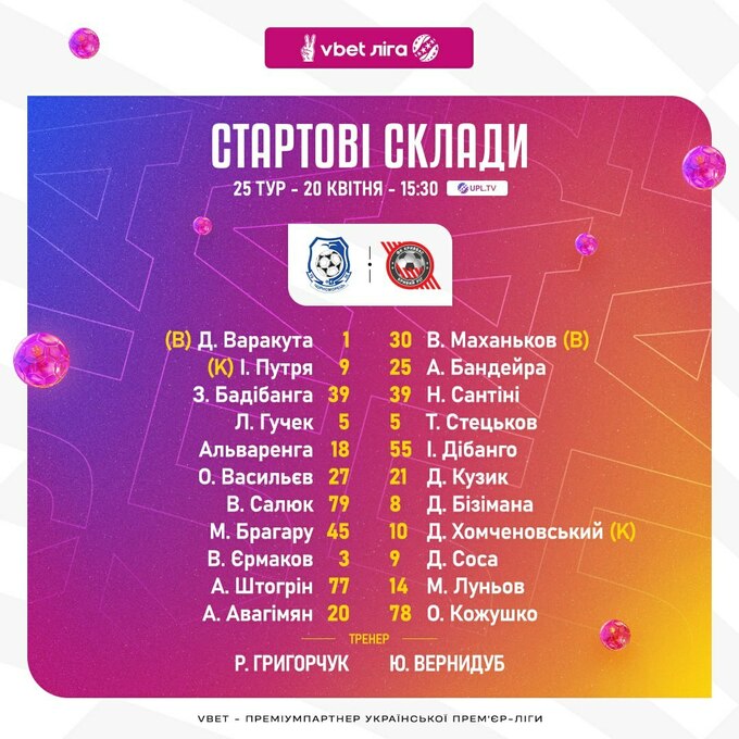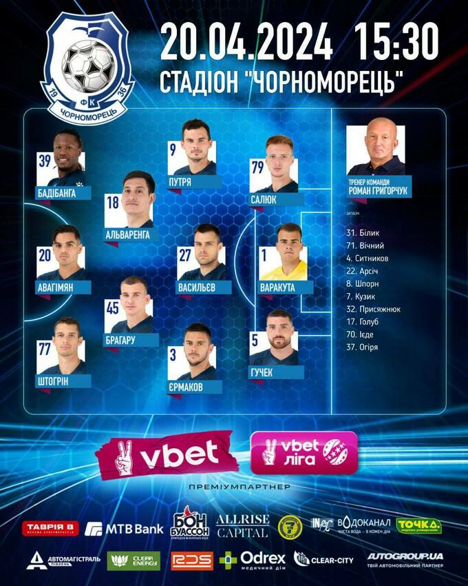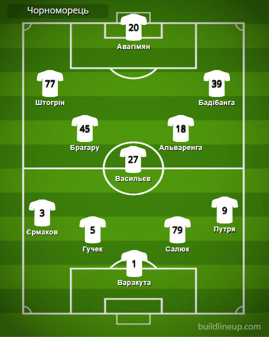 «Чорноморець»: Варакута – Єрмаков, Гучек (Ієде, 80), Салюк, Путря – Брагару, Васильєв (Огіря, 50), Альваренга (О. Кузик, 80) – Штогрін, Авагімян, Бадібанга (Голуб, 90).