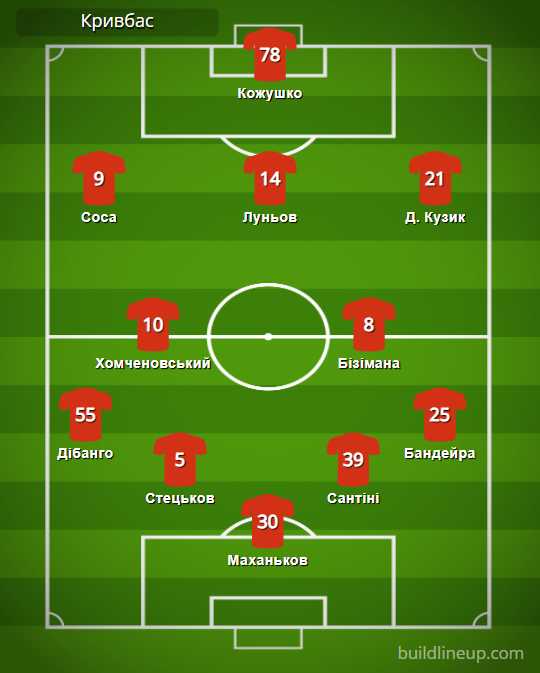 «Кривбас»: Маханьков – Дібанго, Стецьков, Сантіні, Бандейра (По, 90) – Хомченовський, Бізімана – Соса (Микитишин, 46), Луньов (Твердохліб, 76), Д. Кузик (Понєдєльнік, 82) – Кожушко (Задерака, 46).