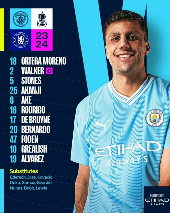 «Манчестер Сіті»: Ортега – Аке, Аканджі, Стоунз (Діаш, 46), Вокер – де Брюйне, Родрі – Гріліш (Доку, 65), Фоден, Сілва – Альварес (Бобб, 88).
