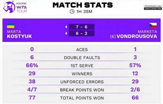Костюк на шляху до фіналу у Штутгарті виграла у трьох суперниць із топ-10 поспіль: Чжен Ціньвень (WTA 7), Коко Гофф (WTA 3) і тепер у Маркети Вондроушової (WTA 8).