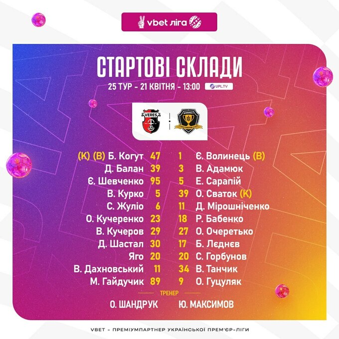 «Верес»: Когут – Шевченко, Жуліо Сезар, Курко (Морозко, 71), Балан – Кучеров, Кучеренко – Шастал, Яго, Дахновський (Шарай, 71) – Гайдучик (Годя, 76).