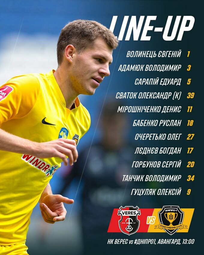 «Дніпро-1»: Волинець – Мірошніченко (Шолупець, 90), Сарапій, Сваток, Адамюк – Бабенко – Лєднєв, Очеретько, Горбунов (Пасіч, 46), Танчик (Гаджиєв, 31) – Гуцуляк.