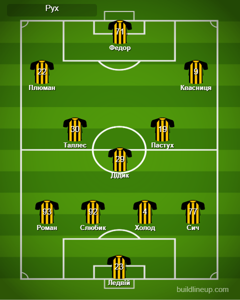 «Рух»: Ледвій – Слюбик, Холод, Сич, Роман – Дідик (Карабін, 70), Пастух, Таллес – Квасниця, Плюман (Руніч, 70) – Федор.