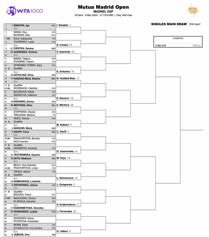 21 квітня відбулося жеребкування ґрунтового турніру WTA 1000 у Мадриді (Іспанія).